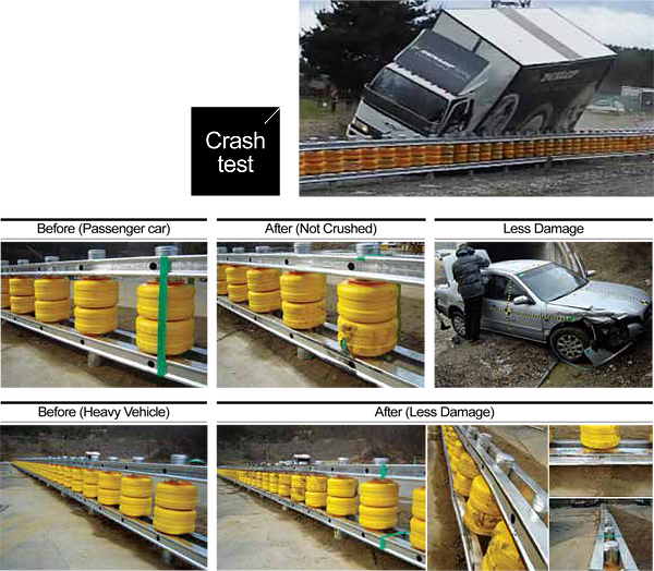 1. The roller barrel is made of EVA and polyurethane composite material. This kind of high strength EVA and polyurethane material is elastic and anti-impact and wear-resistant, which can avoid crashing of the roller barrel. when it is impacted, can effectively protect the guardrail and driver and passengers.